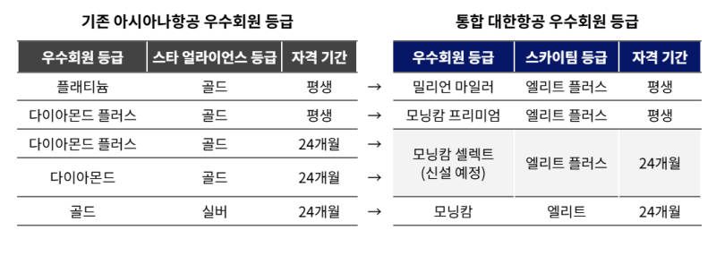 기존 아시아나항공 우수회원은 대한항공의 유사 등급으로 자동 매칭된다. 아시아나의 플래티늄, 다이아몬드 플러스, 다이아몬드, 골드 등은 대한항공의 모닝캄 계열로 연결되며, 자격 기간도 그대로 보장된다.
