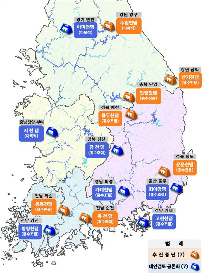 건설이 중단된 7개 댐은 양구 수입천댐, 단양 단양천댐, 순천 옥천댐, 화순 동복천댐, 삼척 산기천댐, 청도 운문천댐, 예천 용두천댐이다. 모두 소규모 댐으로, 홍수·가뭄 대응 효과가 제한적일 뿐 아니라 지역 반대도 심각하다는 것이 환경부의 판단이다.