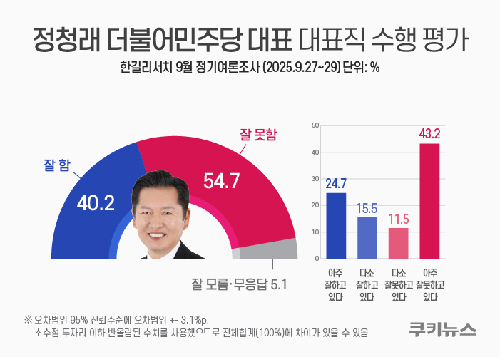 같은 대상에게 ‘정청래 당대표 직무수행’에 대해 질문하자 잘 못함이 54.7%(아주 잘못 43.2%, 다소 잘못 11.5%)로 과반을 차지했다. 잘함은 40.2%(아주 잘함 24.7%, 다소 잘함 15.5%)였다.