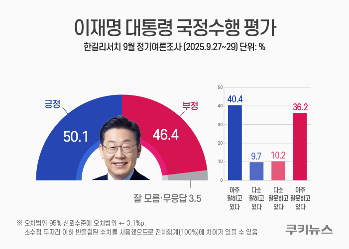 이재명 대통령의 국정수행 지지율이 50.1%로 집계돼 과반을 기록한 것으로 나타났다. 최근 미국 뉴욕에서 열린 유엔총회 참석에 대해서도 국민 절반 이상이 긍정적으로 평가했다.