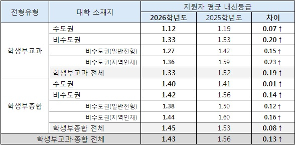 전형별로는 교과전형이 평균 1.33등급으로 전년도 1.52등급보다 0.19등급 상승했고, 종합전형도 1.45등급으로 전년도 1.53등급보다 높아졌다.