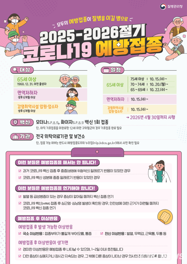 접종은 15일 75세 이상을 시작으로 연령대별로 순차적으로 이뤄지고, 생후 6개월 이상 면역저하자와 감염취약시설 입원·입소자도 같은 날부터 시작한다. 특히 65세 이상은 코로나19와 인플루엔자 예방접종을 같이 할 수 있다.