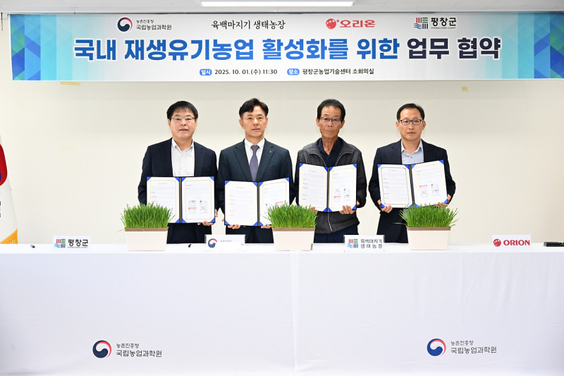 평창군은 1일 평창군농업기술센터에서 농촌진흥청 국립농업과학원, 오리온, 육백마지기 농장과 함께 '재생 유기농업 기반 조성을 위한 업무협약(MOU)'을 체결했다고 밝혔다. 이번 협약은 기후변화 대응과 지속 가능한 농업 확산을 목표로 한 민관 협력 모델이라는 점에서 의미가 크다.