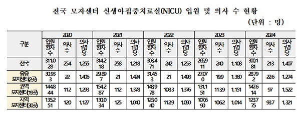 전국 모자센터의 신생아집중치료실(NICU) 입원 신생아 수와 소아청소년과 전문의·전공의 현황을 분석한 결과, 의사 1인당 환자 수는 2020년 1255명에서 2024년 1407명으로 11.7% 증가했다. 권역 모자센터는 1293명에서 1522명으로 17.7%, 지역 모자센터는 1127명에서 1321명으로 17.2% 늘어 권역·지역 모두 부담이 커진 것으로 나타났다. 반면, 중증 모자센터는 입원 환자가 줄고 의사 수가 늘면서 1406명에서 1274명으로 감소했다.