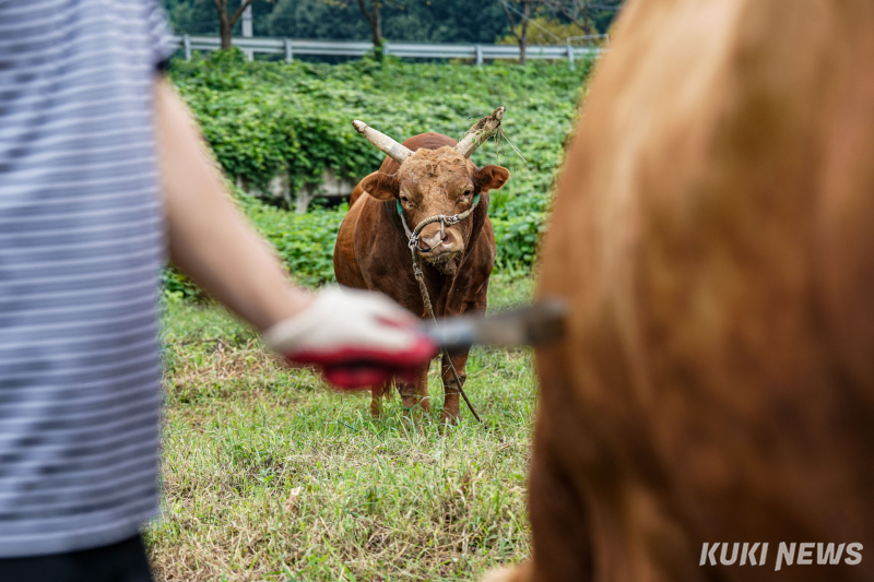 맏형 격인 ‘강투(13)’가 앞장서면 무리가 뒤따른다. 나무에 등을 문지르는 요령, 코뚜레 줄로 얼굴을 긁는 법을 어린 소들은 곁눈질로 배운다. 어느 순간, 고개를 지평선에 맞추고 앞발로 흙을 밀어올리며 리듬을 만든다. 발 구르기, 현장에서는 ‘뜰매질’이라 부른다. 거세하지 않은 수소가 힘을 과시하는 상징적 행위다.