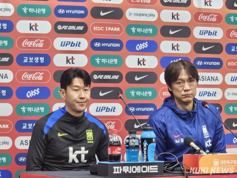 손흥민과 홍명보 감독이 9일 서울월드컵경기장에서 열린 공식 기자회견에 참석하고 있다. 송한석 기자