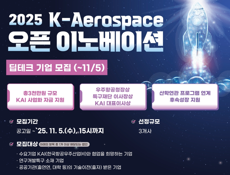 대상은 KAI와 협업을 희망하는 기업 또는 연구개발특구 소재 딥테크 기업이며, 접수는 13일부터 내달 5일까지다.