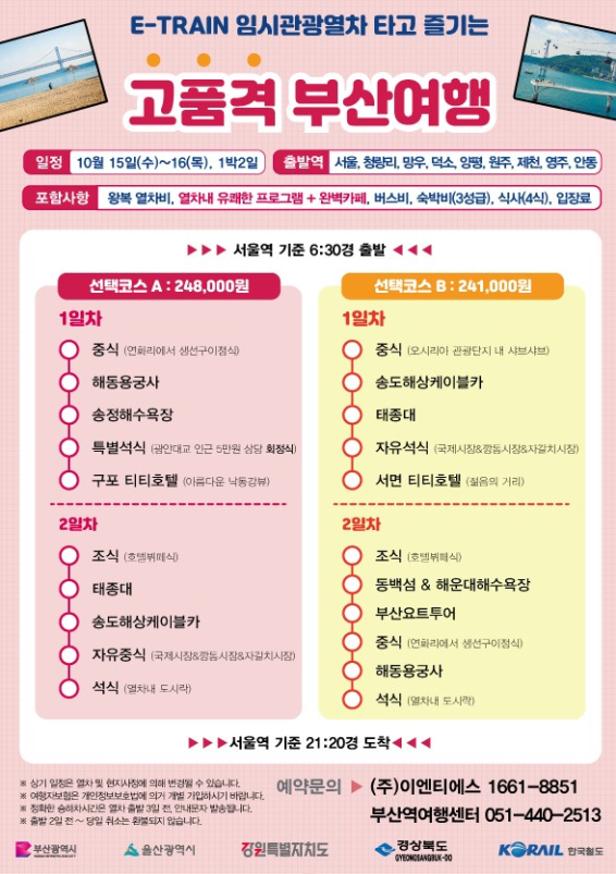 김동훈 시 관광정책과장은 "이번 상품은 부산의 대표 명소와 지역 먹거리를 한 번에 즐길 수 있는 차별화된 기차여행"이라며 "부산만의 매력을 가득 담은 이번 여행으로 모든 여행객에게 특별한 추억을 선물하겠다"고 말했다.