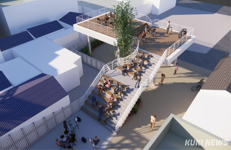 그늘쉼터인 '쉼마루'는 그늘 쉼터와 수목을 활용한 휴식공간을 '어울림마당'에서는 주변을 조망하며 시장먹거리를 즐길 수 있는 전망쉼터도 다음달 준공된다.