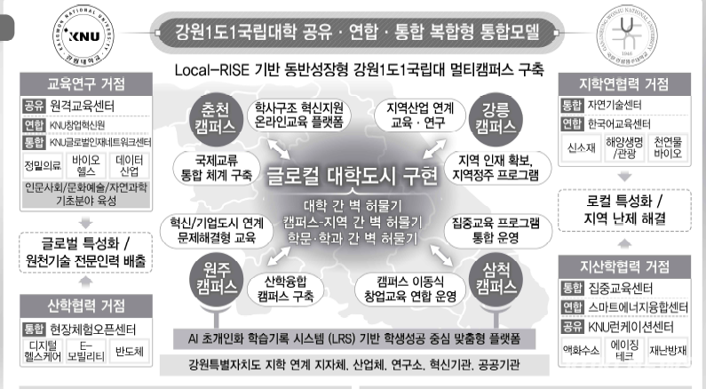 이에 따라 강원대는 춘천, 삼척, 강릉, 원주 4개 캠퍼스를 중심으로 한 권역별 특성화 전략을 세우고, 각 지역의 산업과 인프라, 인재 수요를 반영한 맞춤형 발전 모델을 제시하고, 네트워크를 공유하는 연합형 거버넌스 체계로 운영될 예정이다.