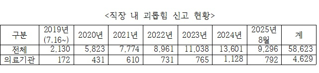 고용노동부에 접수된 의료기관 직장 내 괴롭힘 신고가 최근 크게 증가한 것으로 나타났다.