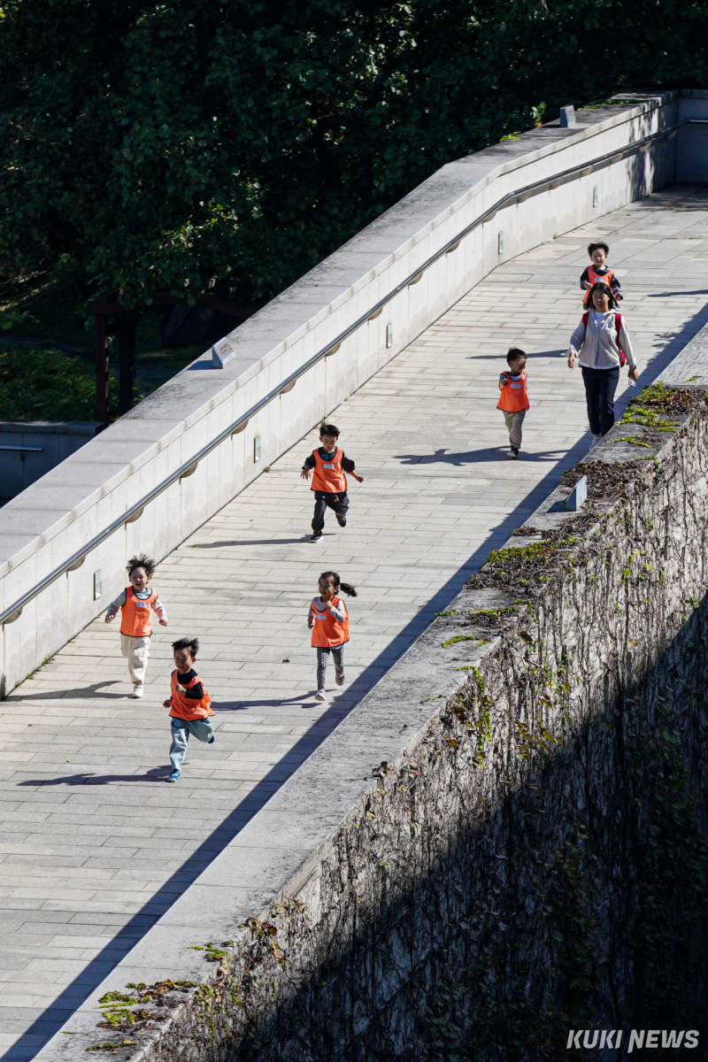 먹구름이 지나가고 파란 가을 하늘이 펼쳐진 16일 서울 용산구 국립중앙박물관 공터에서 어린이들이 뛰놀고 있다.