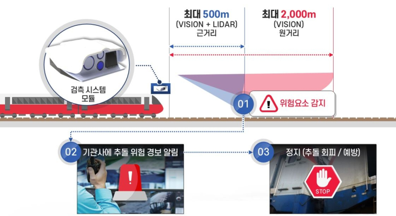 이 장치는 열차 전방 최대 2㎞, 선로반경 500m 이내 장애물을 자동감지하고 위험요소를 인식해 기관사에게 충돌 위험경보를 실시간 전달한다.
