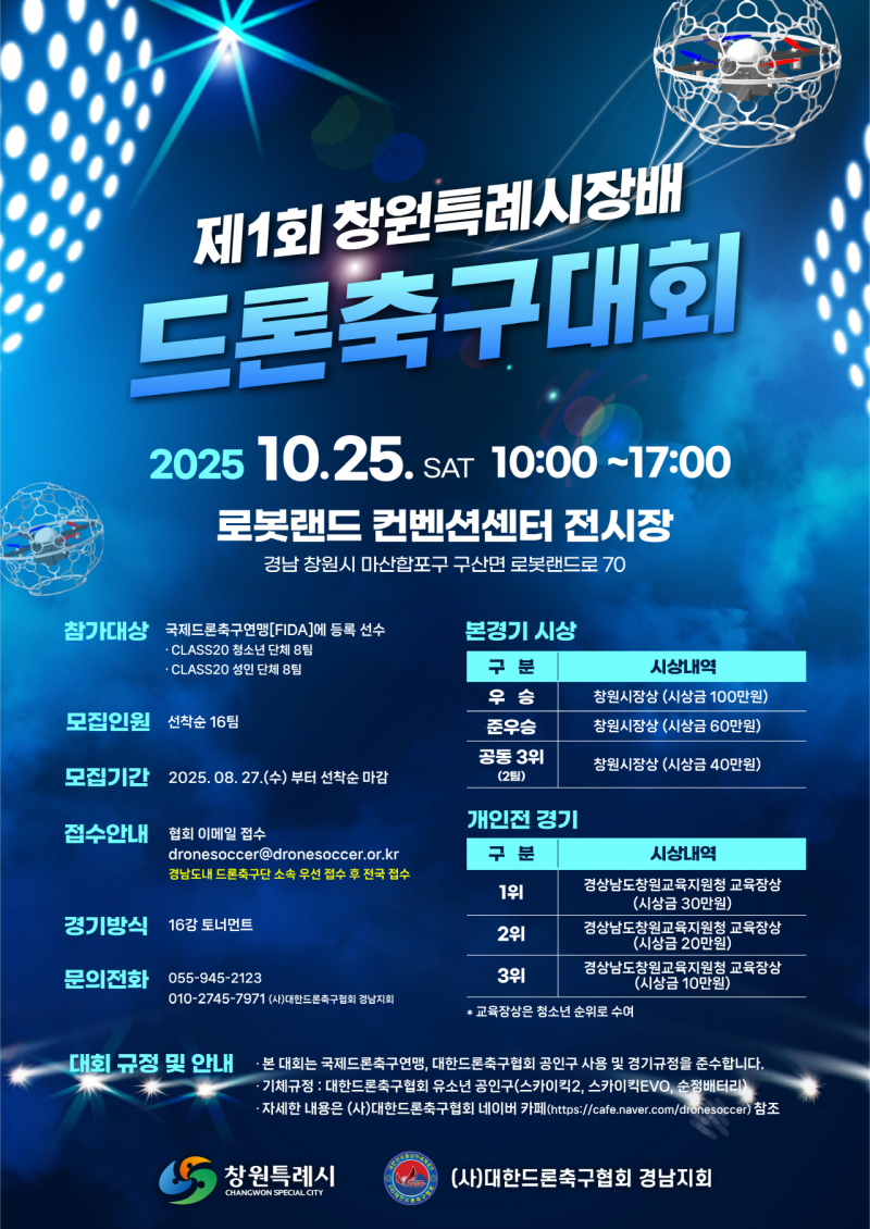 창원특례시가 오는 10월 25일 로봇랜드 컨벤션센터에서 ‘제1회 창원특례시장배 드론 축구대회’를 열고 드론산업과 스포츠를 결합한 새로운 문화축제를 선보인다.