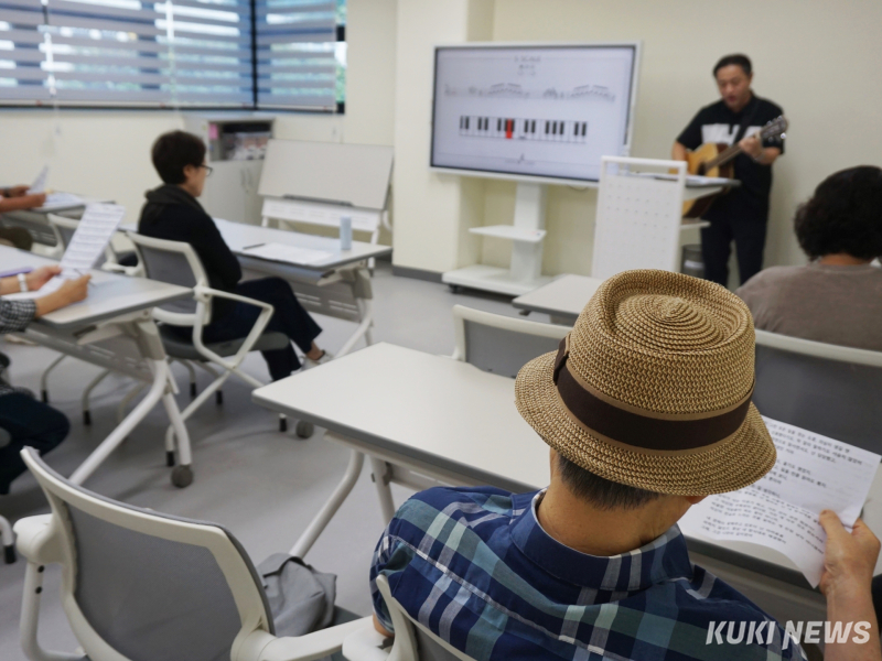 전씨는 지난번 수업에서 배운 프랭크 시나트라의 ‘마이 웨이(My way)’를 혼자서 열창하기도 했다. 특히 노래 후반부에는 수강생 모두가 코러스처럼 합창하면서 교실 속 작은 무대가 연출됐다. 그는 “학창시절에 유행했던 노래를 함께 부르니 참 즐겁다”며 “친구들과 노래방을 갈 때가 있지만 그보다 젊어지는 느낌이 든다”고 소감을 밝혔다.