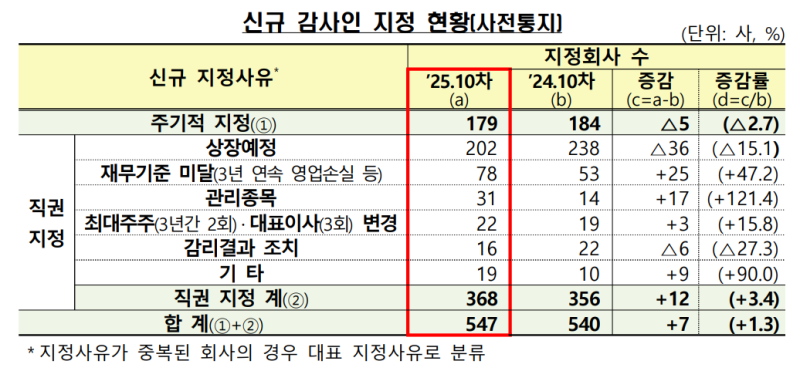 직권 지정의 경우 368곳이 신규로 지정됐다. 상장사 145사와 비상장사 223사 등이다. 지정사유별로는 상장 예정이 202사였으며 3년 연속 영업손실 등 재무 기준 미달 78사, 관리종목 31사 등이다.