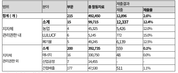 분야별로 보면 농업·폐기물 등 일부 부문은 평균 12% 내외의 제출률을 보였다. 다만 에너지(0.0%), 산업공정(미제출), 간접배출(1.1%) 등 주요 배출 분야는 거의 제출되지 않았다.