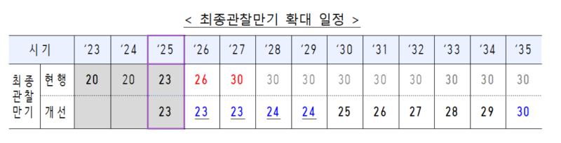 우선 현행 23년인 최종관찰만기를 2035년까지 단계적으로 30년으로 확대한다. 구체적으로는 2026~2027년에는 23년을 유지하고, 2028~2029년에는 24년으로 늘린다. 이후 매년 1년씩 연장해 2035년에는 최종적으로 30년 만기를 적용한다. 최종관찰만기 확대라는 기본 방향은 유지하되, 시장금리 변동으로 인한 급격한 충격을 완화하는 데 중점을 둔 것으로 풀이된다.