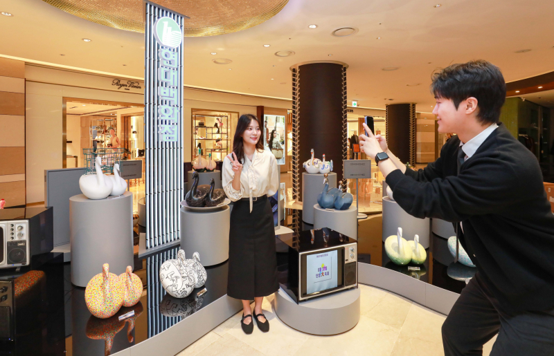 먼저, 오는 30일까지 3층 팝업존에서는 1985년 개점 당시에 현대백화점을 상징했던 백조 로고와 입간판을 활용한 조형물을 선보인다. 입간판 모형을 중심으로 설치된 40개의 백조 모형을 작가마다 특색있게 재구성한 게 특징이다.