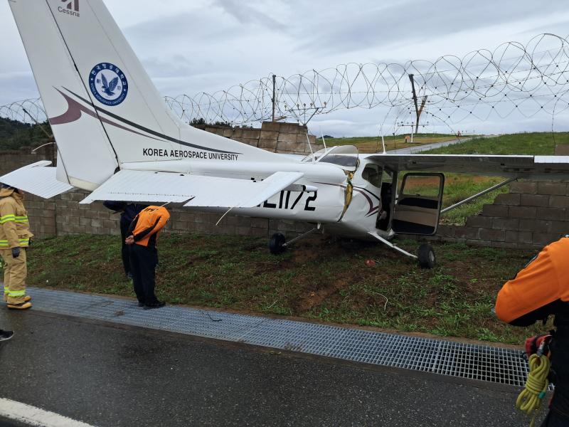경북 울진공항 인근에서 경비행기가 착륙 중 담벼락에 충돌하며 불시착했다.