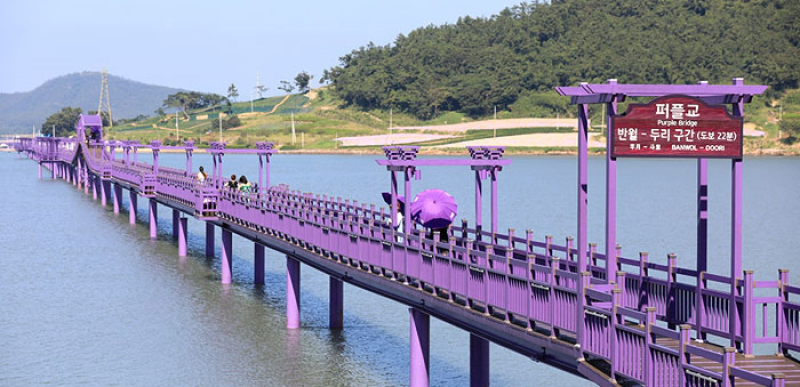 퍼플섬의 해상보행로는 약 1.4km. 반월·박지도를 잇는 다리 위에 오르면 난간, 정자, 우체통, 표지까지 한 톤의 보라가 바닷바람과 함께 스며든다.