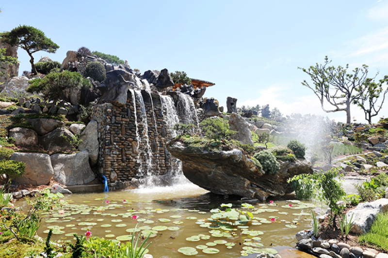 사진을 찍든, 그냥 서 있든, 오늘 여정의 문장부호는 여기서 찍힌다. 바닷바람이 제법 쌀쌀해지는 계절이니 얇은 겉옷과 굽 낮은 신발을 권한다. 자은면 1004뮤지엄파크 수석정원 폭포. /신안군③ 예술과 정원의 프레임 1004뮤지엄파크와 분재공원