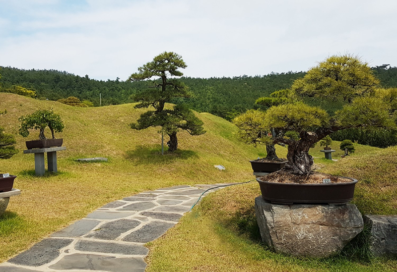 낮은 받침대 위에 올려진 수형들이 단 차를 이루며 줄지어 있고, 나무 한 그루마다 뿌리와 줄기, 잔가지를 손끝으로 다듬은 세월이 겹겹이 쌓여 있다.