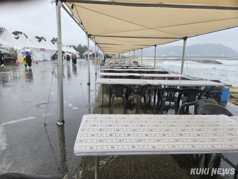 고성명태축제는 이틀째 많은 비가 내리고 바람이 강하게 불었음에도 주최 측은 행사장 어디에도 비를 피할 공간을 마련해 놓지 않았으며 오히려 음식점 앞에 설치된 식사 공간들은 그늘막처럼 조성, 이용에 불편함을 가중시켰다.