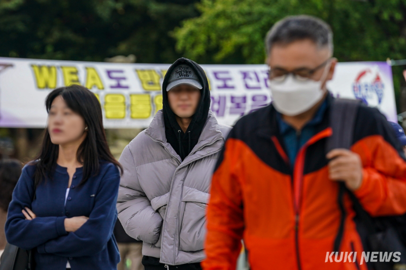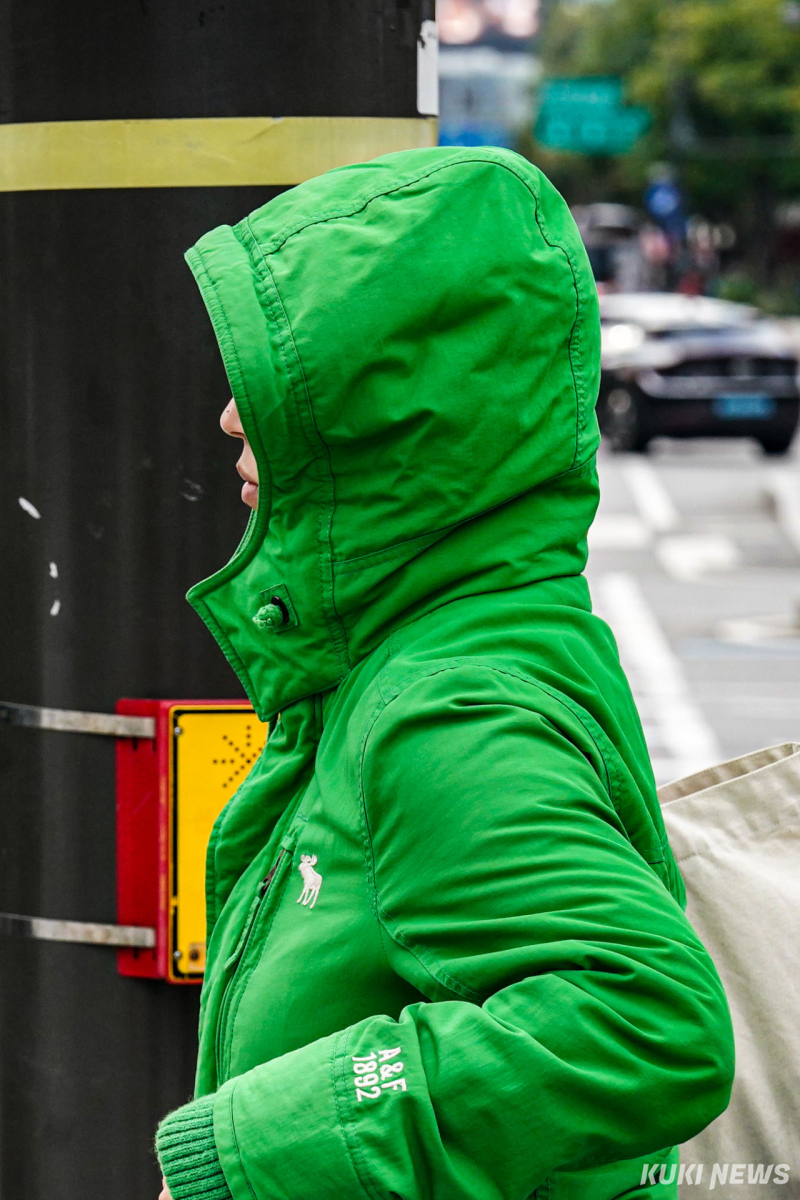 이날 전국 대부분 지역의 아침 최저기온이 한 자릿수로 떨어진 가운데 강풍까지 불어 체감온도는 초겨울 수준이었다. 시민들은 양손으로 옷을 여미거나 따뜻한 음료가 든 잔을 매만지며 출근길에 올랐다.