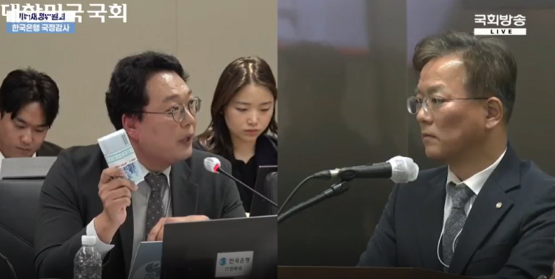 한국은행 국정감사에서 관봉권 띠지가 도마위에 올랐다. 이날 천하람 개혁신당 의원은 관봉권과 관련한 의혹을 풀겠다며 직접 1000원짜리 100장을 개인 계좌에서 찾아왔다.