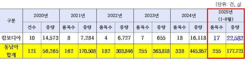 동남아, 캄보디아 마약 밀수 적발 건수, 중량 통계. 정일영 의원실