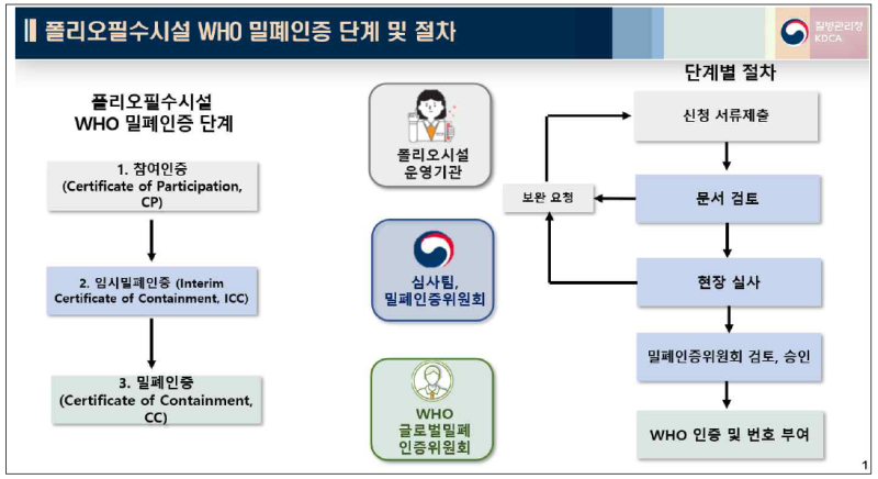WHO 밀폐 인증은 폴리오바이러스의 안전한 취급을 위한 밀폐시설 기준과 위해관리 체계를 평가하는 절차다. 생물위해 관리체계, 교육·훈련, 보안, 물리적 밀폐, 비상대응계획 등 생물안전·생물보안 전 영역에 걸쳐 구성한 기준을 모두 충족해야 한다. 폴리오 필수시설은 WHO로부터 2026년까지 밀폐 인증을 받도록 하고 있다.