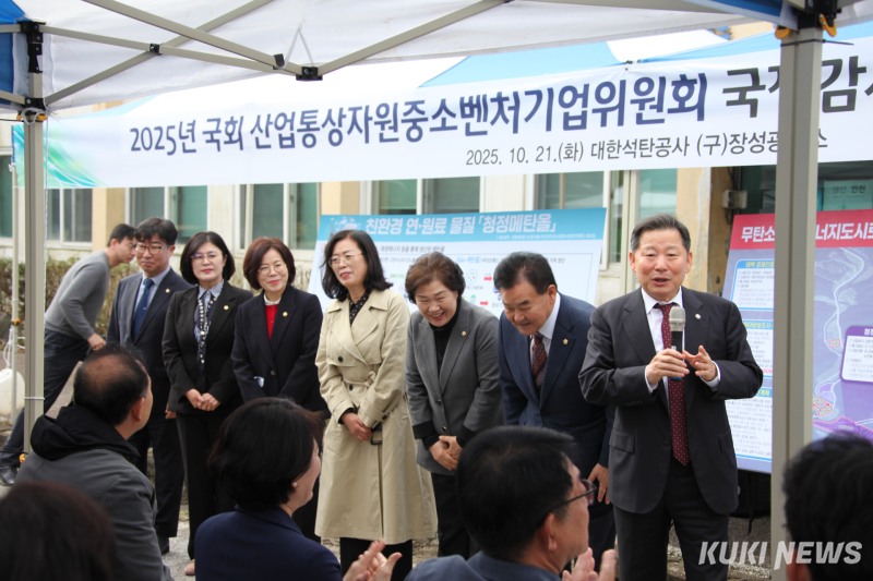 강원 태백시의 대체산업부지인 장성광업소에서 21일 국회 산업통상자원중소벤처기업위원회 국정감사 현장 시찰이 진행 중인 가운데 태백시의회 의원들이 위원회 방문을 환영하는 인사를 하고 있다.