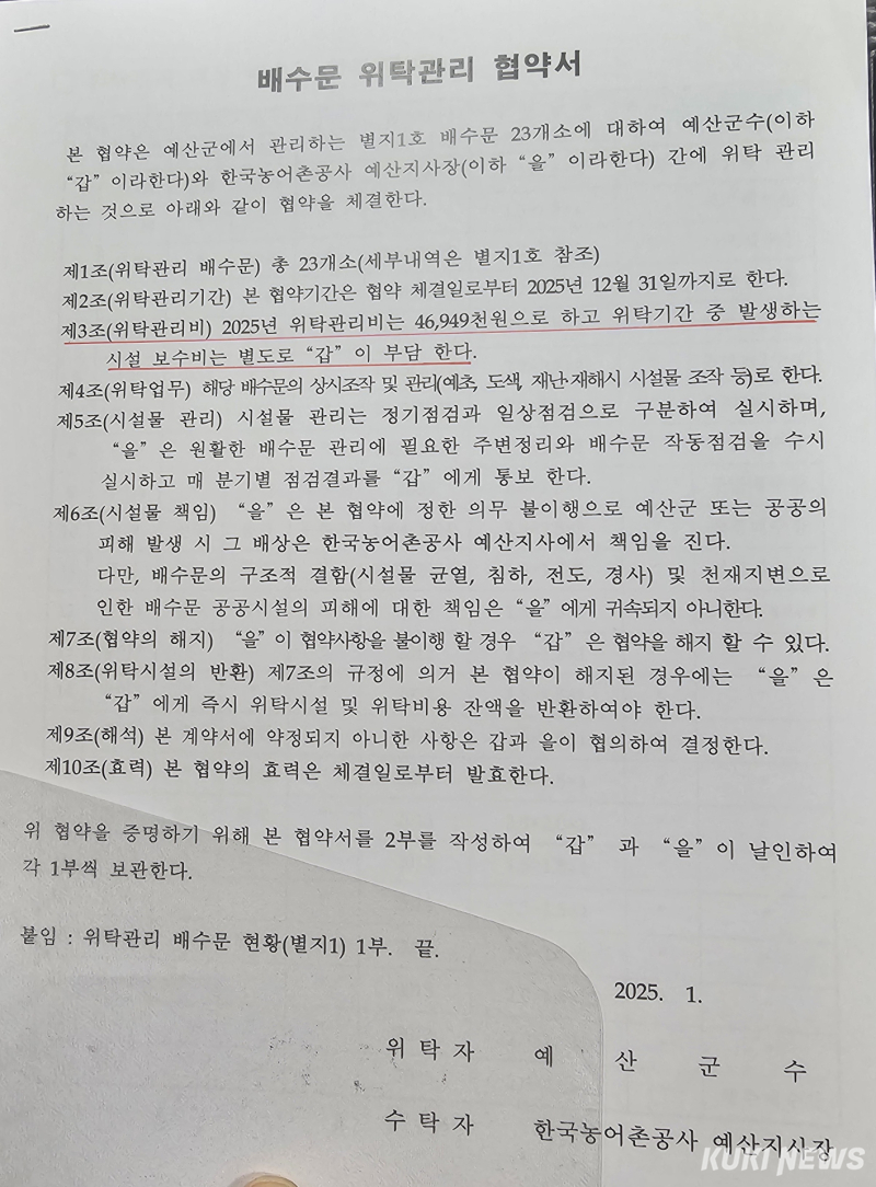 한편 당진시가 농어촌공사에 공기관대행 사업비(용배수로 관리 및 농업기반시설 유지) 명목으로 매년 100억 원을 지원하고 있다.
