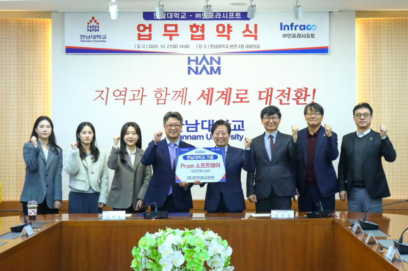 한남대는 21일 오후 2시 본관 2층 대회의실에서 ㈜인프라시프트와 공간정보 기반의 디지털 건축 및 도시 개발 분야 교육 강화를 위한 업무협약식을 체결했다.