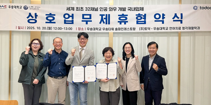 협약을 계기로 우송대와 토닥은 앞으로 인공와우 관련 공동연구, 현장 실습, 산학연계 프로젝트 등을 추진하며 인공와우 기술 및 청각재활 산업의 발전을 위한 협력 관계를 강화할 계획이다.