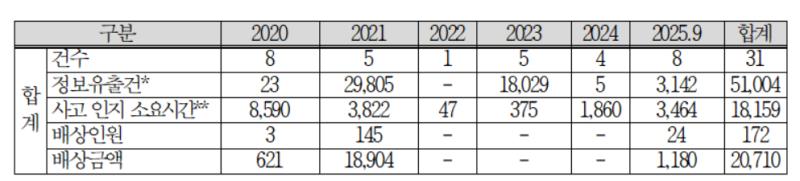 여기에 법인보험대리점(GA) 2곳의 개인정보 유출(4월), 웰컴금융그룹 계열사 웰릭스에프앤아이대부(8월) 등 금융당국의 직접 관리·감독 대상에 포함되지 않는 사고까지 감안하면 실제 피해 규모는 이보다 클 것으로 보인다.