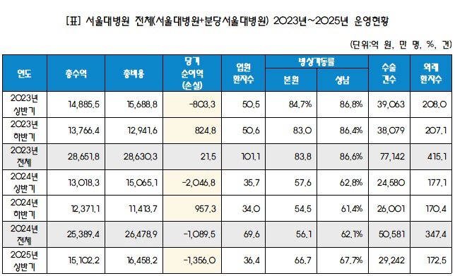 김문수 더불어민주당 의원이 서울대병원으로부터 제출받은 국정감사 자료에 따르면, 서울대병원은 올해 상반기 총수익이 1조5102억원이었으나 총비용이 1조6458억원에 달해 대규모 적자를 냈다.
