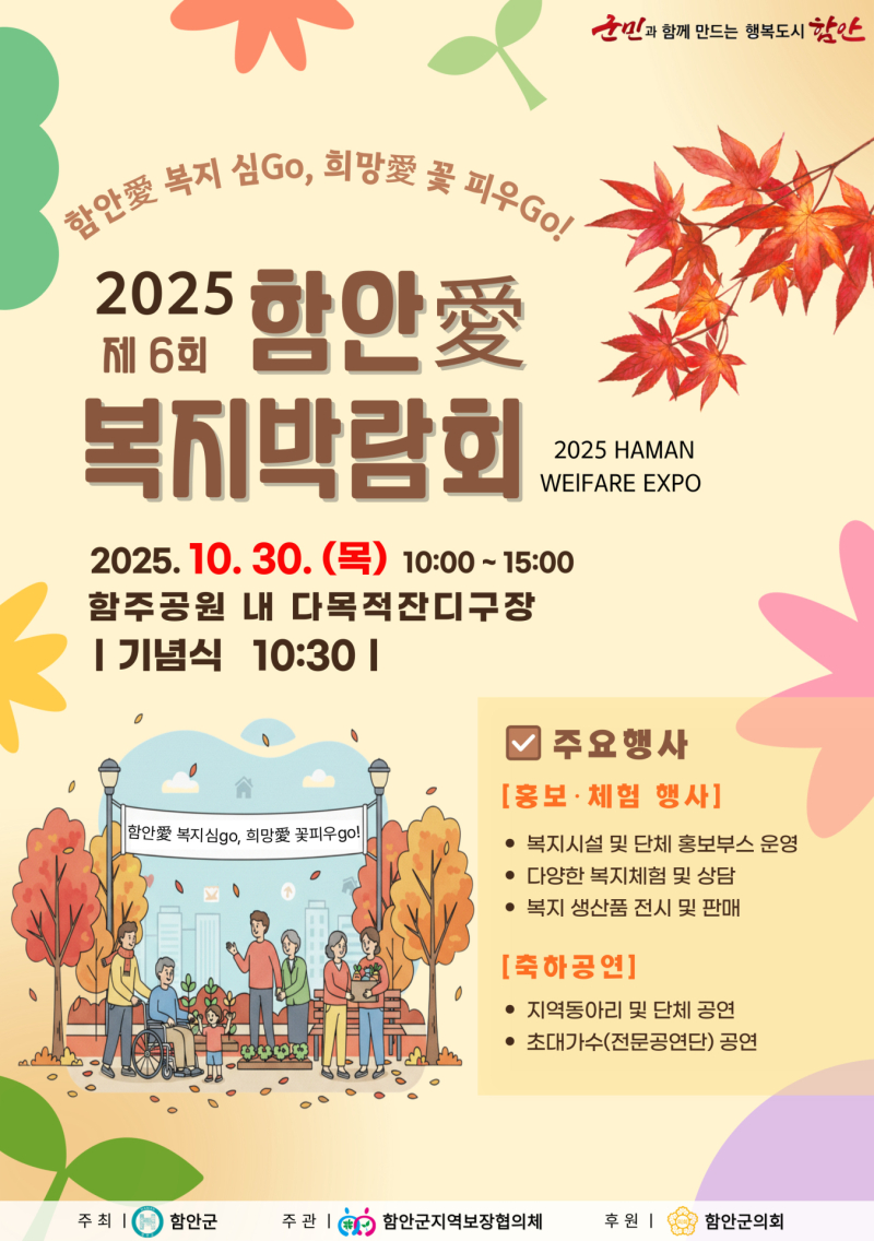 함안군과 함안군지역사회보장협의체는 오는 30일 오전 10시 함주공원 다목적잔디구장에서 ‘제6회 함안애(愛) 복지박람회’를 개최한다.
