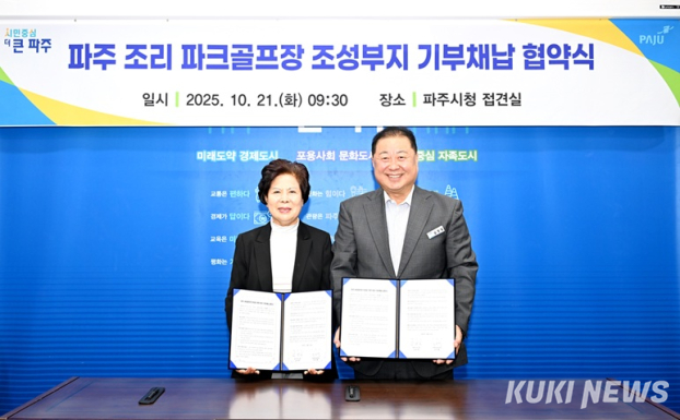 이번 협약은 파주 동부권 주민의 복리 증진과 생활체육 활성화를 위해 추진된 것으로, 토지 기부자 라보배씨가 1만1865㎡ 규모의 부지를 시에 무상 기부함에 따라 파크골프장 조성 사업이 본격화될 전망이다.