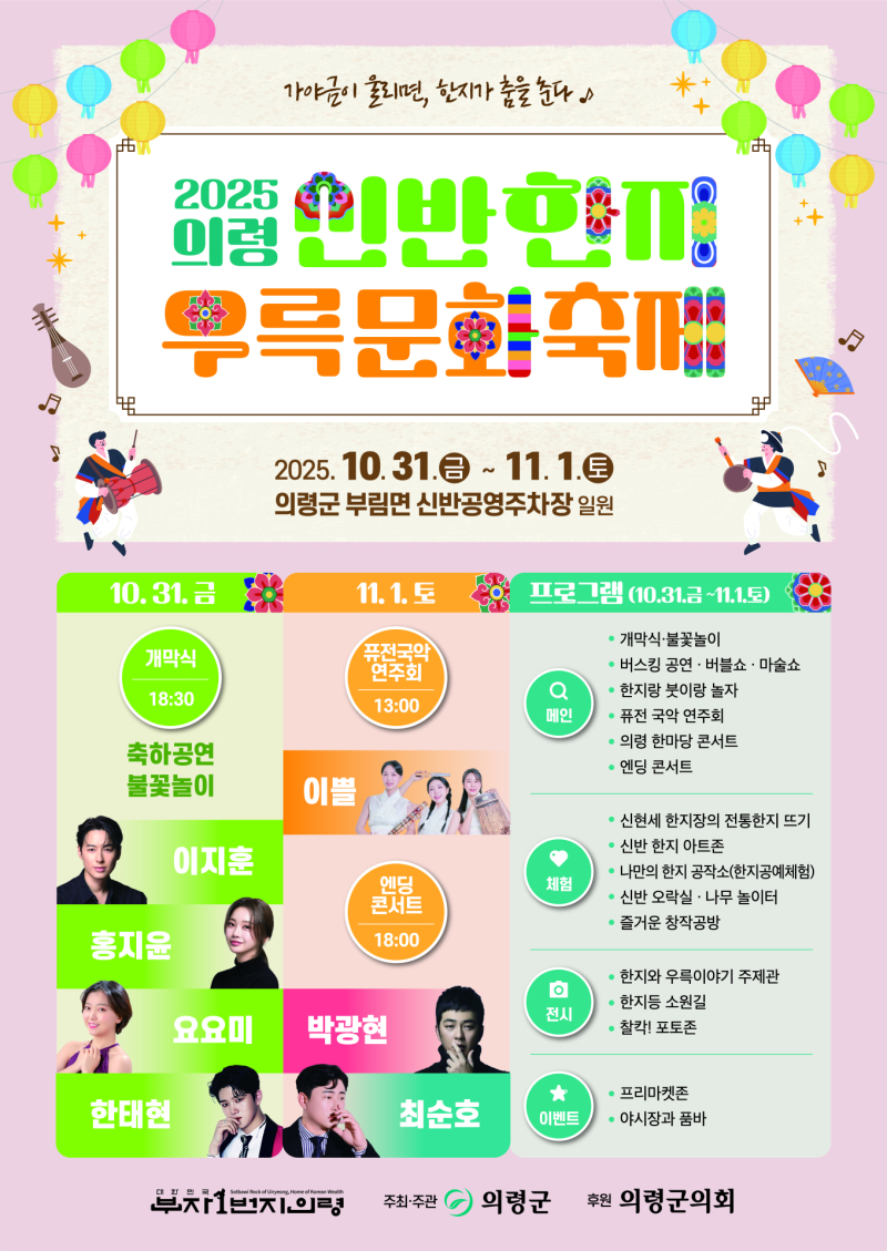 군은 ‘가야금이 울리면, 한지가 춤을 춘다’를 주제로 한 ‘2025 의령 신반한지우륵문화축제’를 10월31일부터 11월1일까지 부림면 신반공영주차장 일원에서 개최한다.