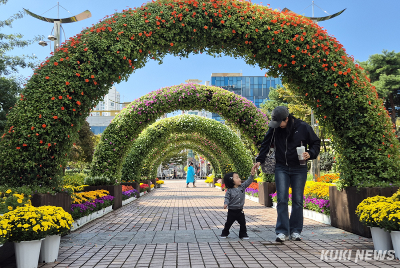 가을이 익어가는 23일 낮, 전남 무안군 삼향읍 전남도청 건너편 중앙공원에 조성된 국화꽃길을 모녀가 걷고 있다.