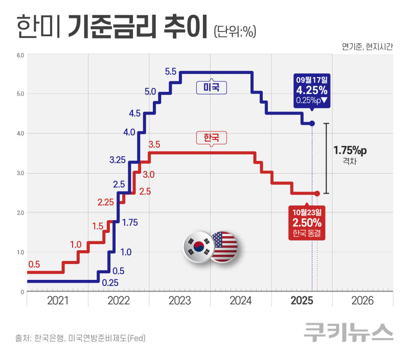 한·미 금리차 축소도 이번 금리 동결 결정에 여유를 더했다. 미국 연방준비제도(Fed·연준)가 지난 9월 연방공개시장위원회(FOMC)에서 기준금리를 0.25%p 인하하면서 양국 간 금리차는 1.75%p로 좁혀졌다. 연준은 오는 29일(현지시간) 열리는 FOMC에서도 추가 0.25%p 인하를 단행할 가능성이 높다는 전망이 우세하다. 이 경우 정책금리 상단은 4.0%로 낮아지고, 한·미 금리차는 1.5%p까지 축소된다. 이는 최근 불안했던 외환시장 부담을 완화할 요인으로 작용할 전망이다.