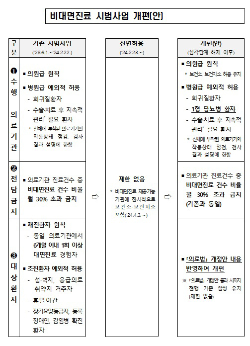 이 규정은 코로나19 팬데믹 당시 의료기관 기준을 어기고 사무실에서 스마트폰만으로 비대면 전문 의료기관을 운영하던 불법 행위를 막기 위한 조치다. 이에 따라 대면 진료 기록이 없는 의료기관과 약국은 비대면 진료 시범사업에 참여할 수 없다.