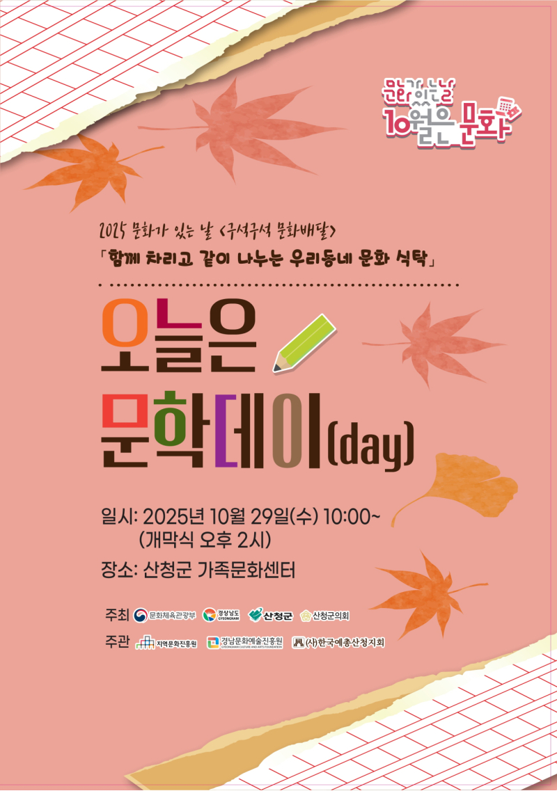 산청군은 오는 29일 가족문화센터에서 ‘오늘은 문학데이(day)’ 행사를 운영한다. 이번 행사는 문화체육관광부의 ‘2025년 문화가 있는 날 구석구석 문화배달 사업’의 일환으로 추진된다.