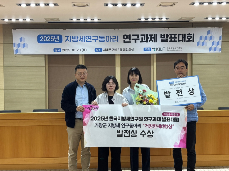 거창군 지방세 연구동아리 ‘거창한세(稅)상’이 10월23일 한국지방세연구원에서 주최한 ‘2025년 지방세 연구동아리 연구 공모 발표대회’에서 발전상을 수상하며 전국적인 성과를 거뒀다.