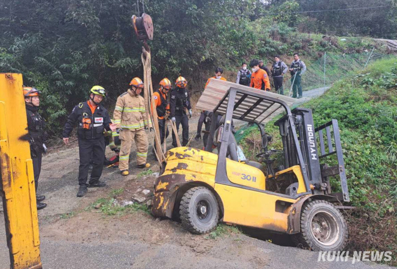 강원 원주에서 지게차가 도랑에 빠지면서 운전자가 깔려 숨지는 사고가 발생했다.