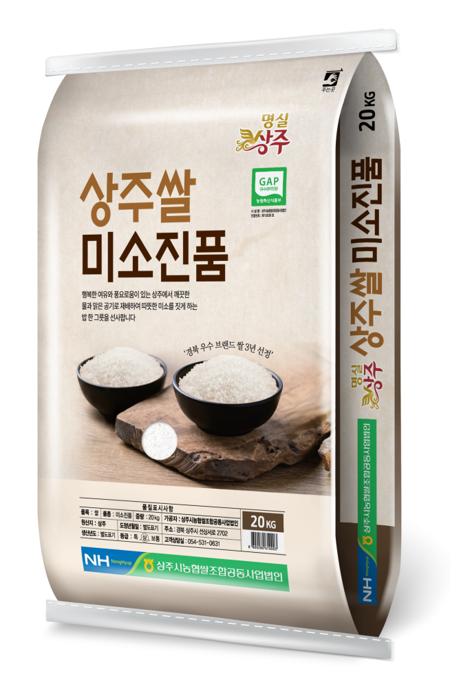 ‘미소진품’ 쌀은 상주에서 재배된 프리미엄 쌀로, 윤기와 찰기가 뛰어나 쫄깃한 식감과 깊은 밥맛을 자랑한다.