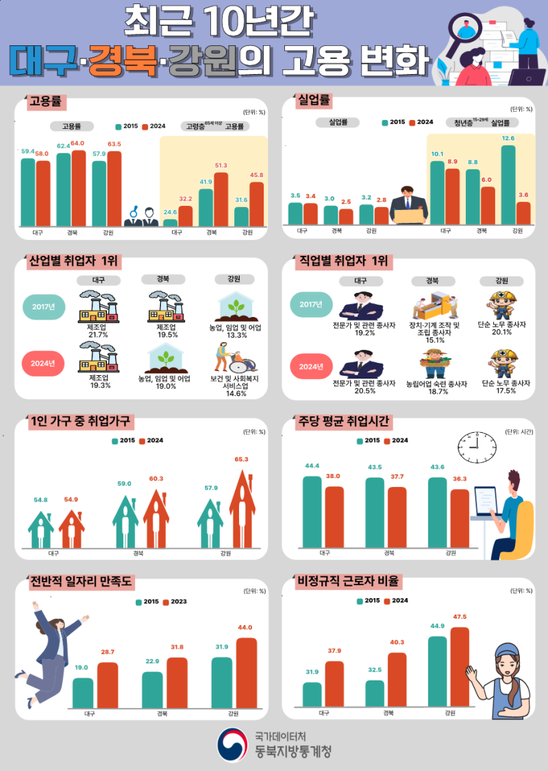 청년층(15~29세) 고용률은 대구 37.5%, 경북 41.3%로, 대구는 10년 전보다 1.8%p 하락했으나 경북은 거의 변동이 없었다.