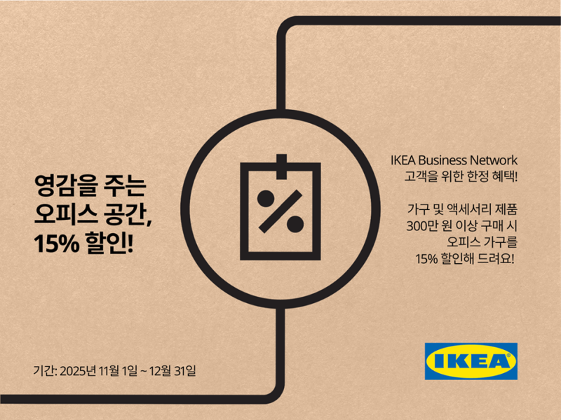 이케아 코리아가 11월 1일부터 12월 31일까지 이케아 비즈니스 네트워크 멤버를 대상으로 ‘영감을 주는 오피스 공간’ 할인 행사를 진행한다고 27일 밝혔다.